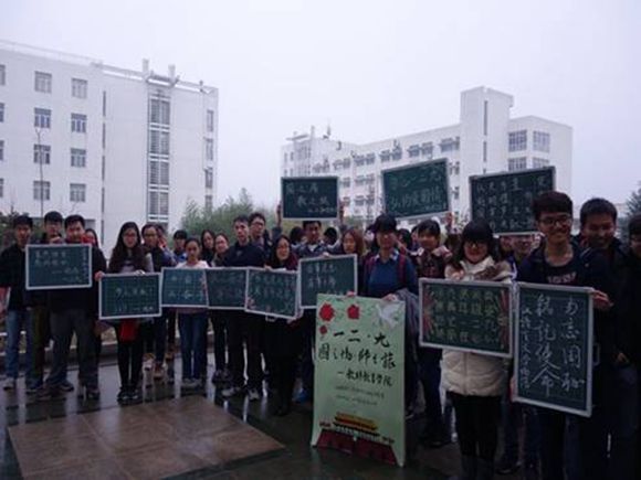 具有师院特色的小黑板上,写下了行行纪念“一二.九”运动的诗歌和寄语,师院各年级学生以寝室为单位,高举着书写心声的小黑板进行合照;携手并肩,众志成城,敬文图书馆前,航拍镜头记录下的,是博彩网址大全