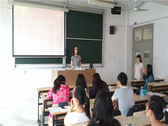 本科生思政党支部在仙林校区学海楼417教室召开预备党员转正大会,讨论关于周静、陈正华、徐慧敏、吴怡雯共4位同学转正的决议。大会由本科生思政党支部书记徐能学同学主持,支部成员准时到场参加。