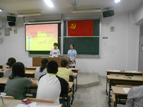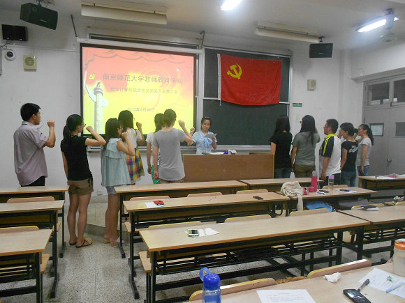 伴随着庄严的国际歌,会议拉开了帷幕。首先,宋文斌等八位发展对象依次向党组织汇报了个人情况,随后由各自的入党介绍人向大家介绍发展对象的具体情况,并对是否同意其入党发表意见。在紧接着的答辩环节中,在座的党员围绕党建党性,入党动机以及作为师范生党员该如何起先锋模范作用等问题向发展对象进行提问。八位发展对象在平时严于律己,在生活学习中积极主动地帮助身边的同学解决各类疑难问题,面对党员们提出的各类问题从容镇定,观点独到,得到了大家一致的认可。之后,党员们根据发展对象的表现进行了慎重的投票表决。在八位发展对象汇报结束之后,主持人统计了正式党员的投票结果,并宣布了此次支部党员发展大会决定吸收宋文斌等八位发展对象成为中共预备党员的决议。紧接着,发展对象们庄重地对着党旗宣誓,并响亮地喊出了宣誓人的名字。