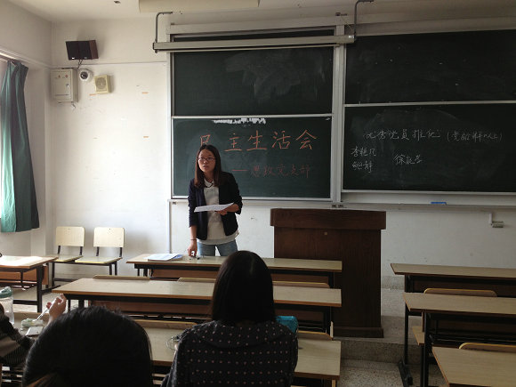 会议开始,吴建婷、蔡敏瑜两位大一的预备党员走上讲台进行了各具特色的自我介绍。而后,优秀党员选举正式开始。首先,由学院推荐的徐能学同学上台介绍了自己转正一年多以来的工作情况,实事求是地阐明了自己工作中的优秀与不足之处,并虚心接受同学们的意见与建议。接着,鲍静同学代表因病未能出席的李艳凡同学阐述了她平日生活里的工作学习情况以及其作为宣传委员对支部的巨大贡献。最后,鲍静同学对自己入党以来的表现进行了简要阐述,表明了自己作为党员,将刻苦努力,认真工作,始终贯彻党的方针与精神,提高自身各方面的素质的决心。