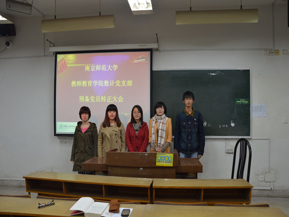 雄浑的国际歌声中,全体党员肃然起立。本次转正大会分为5个主要流程,首先是章佩同学等5名预备党员向党组织汇报一年来的学习、工作、生活作风等方面的表现,随后由各自的入党介绍人介绍转正申请人在考察期内的表现,并对其能否转正进行评议。紧接着,在答辩环节中,在座的党员向申请人提问,大家大多围绕党建党性,中共十八届三中全会等内容进行提问。5位预备党员在平时严于律己,并且在生活学习中积极主动地帮助身边的同学解决各类疑难问题,面对党员们提出的各类问题从容镇定并用自己独到的观点回答,得到了大家一致的认可。之后,正式党员们根据预备党员的表现进行了慎重的投票表决。在5位预备党员汇报结束之后,主持人统计了正式党员的投票结果,并宣布了此次支部预备党员转正大会一致同意章佩同学等5名预备党员按期转为中共正式党员。紧接着,发展对象们庄重地对着党旗宣誓,并响亮地喊出了宣誓人的名字。