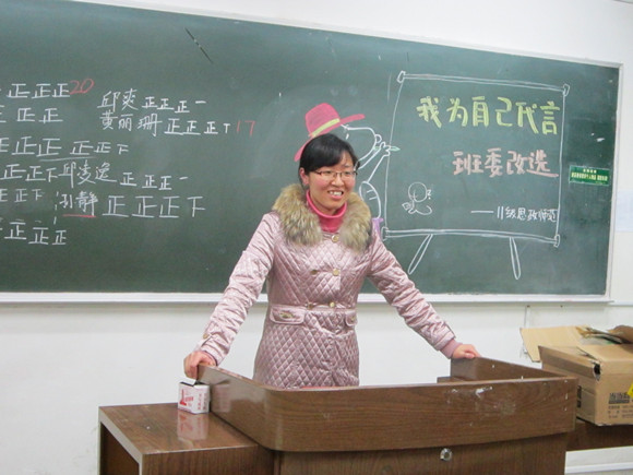 班会的第二个流程是班委述职和班委竞选。首先由原班委进行自己工作方面的总结和回顾,接着,由班内同学自由竞选想做的班委一职。此次班委竞选的最大亮点在于增添了同学问答环节,同学们可以随意对竞选班委的同学进行例如班级建设、班级构想之类的问题,来为自己赢得选票。在接下来的时间里,思政班的同学们进行各自的竞选宣言。统计票数的时候发现竞选生活委员的两位同学孙静和黄萌萌票数一样,于是翟老师提议再进行一次拉票环节。于是同学们又各自为心目中的生活委拉票或者投票,结果很是令人意外,两位同学的票数仍然相同。最后班长决定让两位同学在接下来的一学期轮流来做生活委为班级服务。这次竞选激烈,好几位同学的票数极为接近,真是悬念重生。