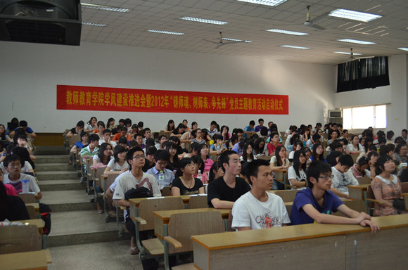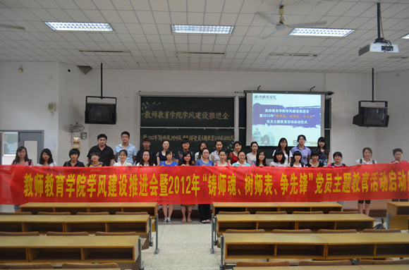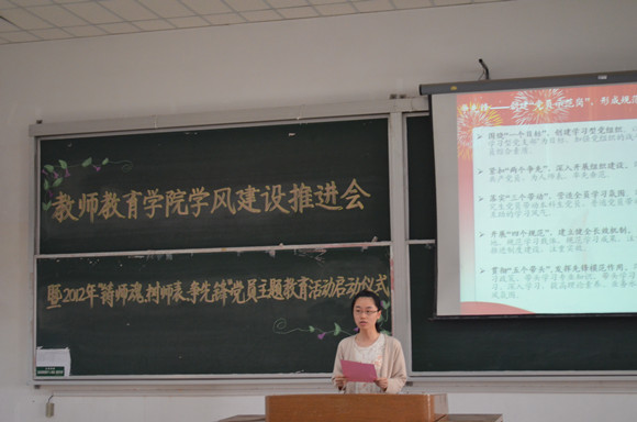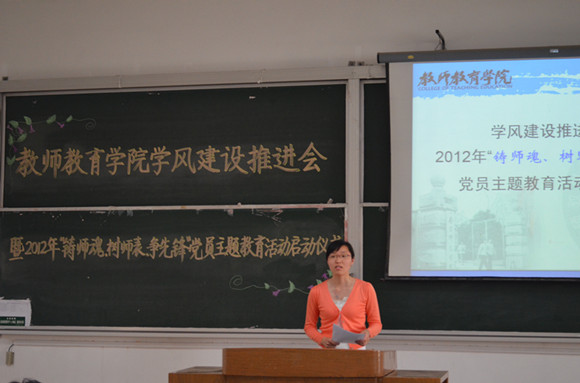 在学明楼202教室召开2012年“铸师魂、树师表、争先锋”党员主题教育活动启动仪式,学院党委副书记朱冬梅老师、团委书记支景老师和10级辅导员李晓亮老师出席会议,会议由11级辅导员翟云秋老师主持,全院所有学生党员、学生组织的主要干部以及所有班委都参加了会议。