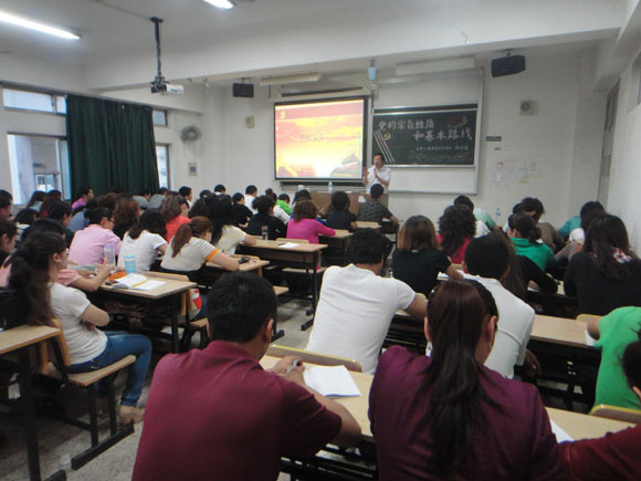 关于党的宗旨,陈老师从党的价值取向、本色、试金石三个层面论述了“全心全意为人民服务”的深刻含义,并结合党的宗旨在不同历史时期的体现以及对中学课文《纪念张思德》的回顾,形象生动地阐释了马克思主义唯物史观对党宗旨的深远影响和“为人民服务”这五个字的深刻含义。在随后介绍党在新时期的三大历史任务时,更结合了近期热门的台海关系问题和黄岩岛领土争端,感叹了祖国统一的任重道远,表达了世界和平与发展的美好愿景,充分阐释了党与时俱进的先进性和为国为民谋利益的精神。学员们都以认真的记录、及时的反馈展现着他们对这节党课的积极参与。尤其是陈老师以新疆维吾尔自治区自成立至今的经济发展历程为例讲解党的基本路线相关概念时,学员们更是侧耳倾听,频频点头回应,眼神和笑容里流露的分明是身为新疆人的自豪与油然而生的更深沉的责任感。