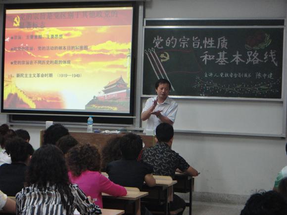 活动在热烈的掌声中正式开始。石红云老师首先对学员们的日常学习生活状况和此次培训的目的做了简单介绍,建议学员们认真聆听党课并记好笔记,在学习党的相关理论知识的同时积极反思,提高自身素养,积极向党组织靠拢。朱冬梅老师也表达了对学员们的学习生活的关心,肯定了大家自立自强、积极进取的精神,并祝愿学员们能在党课培训中得到切实提高。随后,陈中建老师以“党的宗旨、性质和基本路线”为主题,为学员们上了一堂生动精彩的党课。