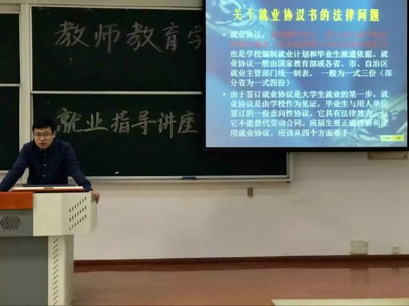 随后,朱老师讲了关于就业协议书的法律问题。就业协议是明确毕业生、用人单位和学校在毕业生就业工作中权利和义务的书面表现形式。由于签订就业协议是大学生就业的第一步。就业协议是由学校作为见证,毕业生与用人单位签订的一份意向性协议,它具有法律效力,但它不能替代劳动合同。