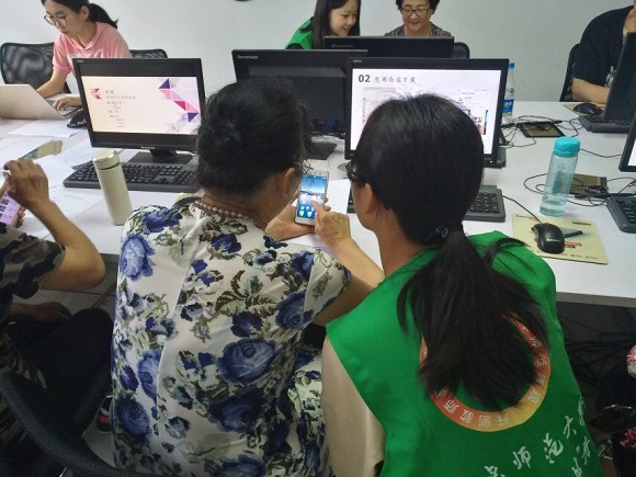 在帮助学员们安装软件的同时,志愿者们也自然而然地与学员们攀谈起来。就如对待自己家里的长辈一样,志愿者们一边将新潮的知识传授给他们,一边听着他们讲述自己的家事、故事。有的学员甚至要花费两个小时的路程来到这里上课,这更激起了志愿者们认真服务的热情。