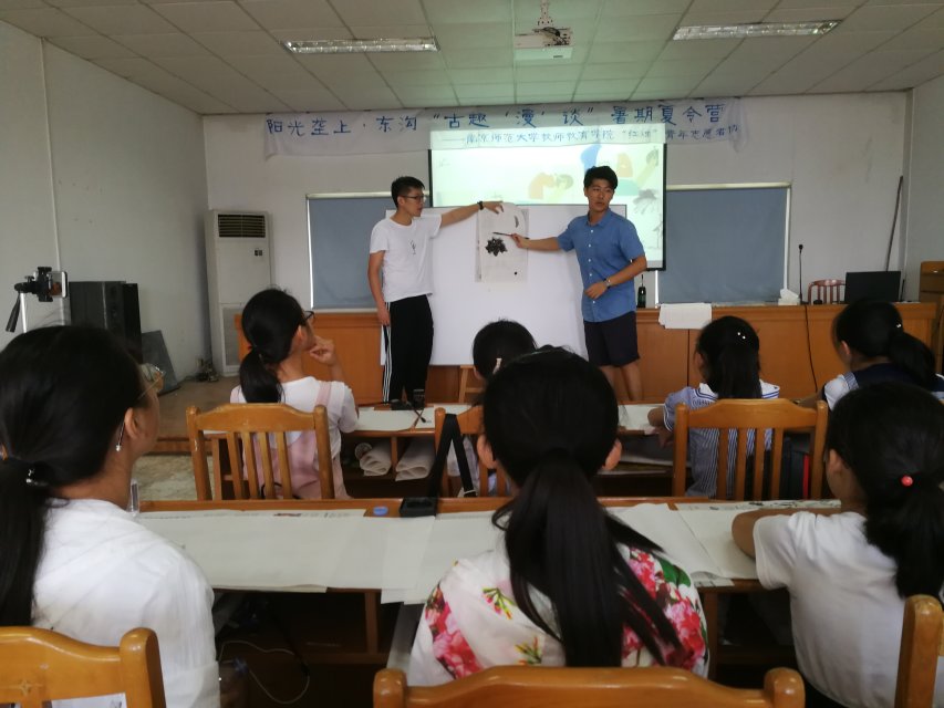 首先,徐欣雨同学和小朋友们一起观看了经典国漫《没头脑和不高兴》,并且就动画内容,以分组比赛的形式进行了课堂问答活动,小朋友们对新奇的课堂形式表现出浓厚的兴趣,课堂气氛一时高涨。接着喇舜尧同学从早期水墨动画《三个和尚》故事新编的动画内容和细节,引申讲到关于“三个和尚”这一故事的内涵道理,但保留了这个故事的结局部分没有公开。第三节课时,喇舜尧同学又带领小朋友们开展了水墨画创作,大家通过画笔,创作了自己心目中“三个和尚”故事的结局,画风也都形式各异,丰富多彩。