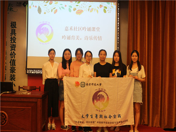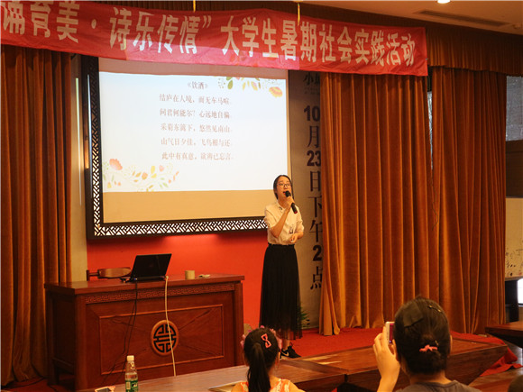 “吟诵育美,诗乐传情”暑期实践团队于江苏省昆山市嘉禾社区成功举办“吟诵学堂”吟诵教学活动。活动特邀淮阴师范学院采菊诗社副社长夏韵秋表演吟唱并教学,现场气氛热烈,观众表现踊跃。