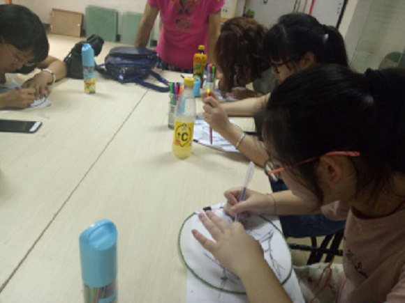小组成员们集体来到艺术馆里,与老师一起进行了画扇的学习。本次的活动主题是向老师学习画唐扇,首先老师仔细讲解了画扇的基本步骤,先用黑笔描,再用彩笔上色,最后题诗、盖章。除了描边,其他步骤都可以自由发挥,不受限制。然后每个人拿到老师事先准备好的材料开始进行实践。最后,所有人将成品拿在手上,向指导老师展示了自己的作品。制作过程中有欢笑,在笑声中,每一个人都对自己的作品认真负责。