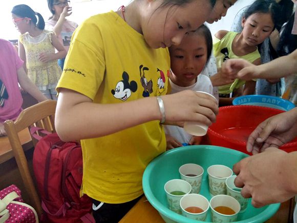 接着,曹楚凝老师为孩子们带来了一节理化生实验课。出身化学师范的曹老师发挥专业特长,向孩子们介绍了水溶液中的化学奥秘。曹老师首先通过一系列不同倍速下化学反应现象展示吸引孩子们的注意力,接着绘声绘色地讲述了溶液的酸碱性,邀请孩子们用手中的试纸检测事先准备的三种溶液,说出现象。最后来到了海藻酸钠与乳酸钙的混合实验,孩子们满怀期待地看着老师的一举一动,在获得产物时连连发出惊叹。轮到自己动手时,孩子们跃跃欲试,围着老师询问其中的奥秘,主讲曹老师与各位助教认真解答。这堂别开生面的实验课培养了孩子们的动手能力,激励着孩子们做生活的有心人,发现日常生活中的化学美。