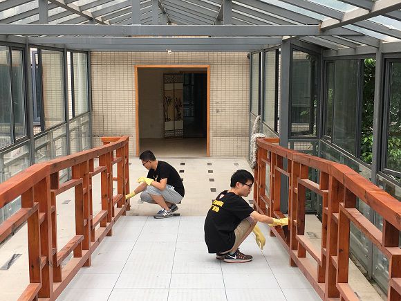 7月6日上午,“乌鸦反哺,‘空巢’不再”暑期社会实践小队全体成员来到了栖霞区颐养中心,开启了他们最后一天的敬老院之旅。今天他们的任务与前几天相比较为轻松,只有打扫多功能厅一项工作。