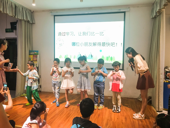 小队成员于下午一点半准时到达凤凰书城四楼集合,为本次暑期实践活动的第一次授课做准备。队员们调试好了媒体设备,准备好了小凳子之后,孩子们就立刻坐满了位置,翘首期待这次的活动。主讲吴凌新首先以较简单的鸳鸯扣带领孩子们入门,在讲解完如何巧解鸳鸯扣后,许多小朋友都非常感兴趣,并且积极上台亲自解开鸳鸯扣,主讲和助教们一起帮助有困难的小朋友。在所有小朋友基本学会之后,进行了“解鸳鸯扣”比赛,并且将鸳鸯扣以及糖果作为奖品给了前三名的小朋友。紧接着的是较难的九连环的讲解,考虑到时间因素,主讲吴凌新只讲解了前面五个环怎么解,并且教会了小朋友们解九连环的技巧,这一阶段的游戏小朋友、家长、主讲、助教齐上阵,可见九连环的深受喜爱。在解开五个环之后,小朋友们都欢呼到:“哇,我解开了!”。在课后,还有许多小朋友和家长问主讲一些关于九连环的问题。家长和孩子们意犹未尽的追问体现了九连环作为中国传统的益智游戏的代表直至今日仍然具有很大的魅力,仍然深受人们的喜爱。