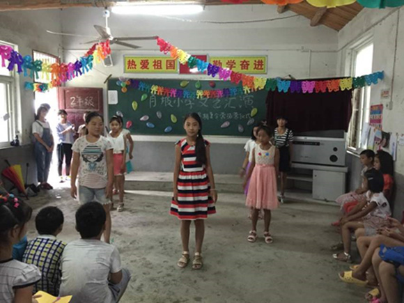 7月20日下午,“锦瑟为伴,童心相随”小队成员在安徽阜阳临泉县瓦店镇肖坡小学带领孩子们参与文艺汇演活动。