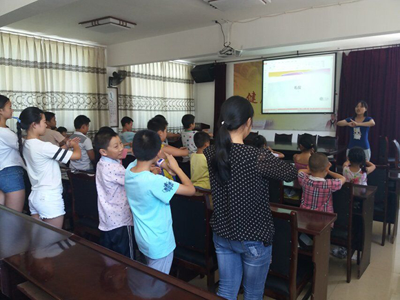 继昨天金龙拍拍操、夹乒乓球、报团等破冰游戏后,支教队于15日上午开展第一次素拓活动,整个素拓活动由来自成都电子科技大学的王月华同学带领,包括拍七令、大风吹、七手八脚等活动,获胜同学有相应奖励,输掉的同学要上台做自我介绍。这样的教学模式不仅促进了同学们积极参与到课堂中的热情,更增进了孩子们相互间的了解。
