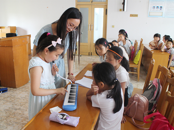 在下午的课程里,李博文同学帮助孩子们复习了点的写法,又对横、竖两个笔划写法进行了重点指导。浓浓的墨香里,学生们的书法兴趣逐渐萌芽。而郁丹同学则详细介绍了中西方多种多样的乐器,辅以乐曲欣赏,希望能让孩子们体会到音乐的魅力。她还准备了特殊的乐器——口风琴,现场演奏并协助孩子吹奏,课堂效果显著。
