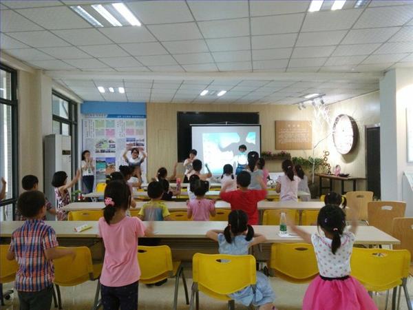 实践活动正式开始之后,首先朱琳同学向全体小朋友对本小队进行了一个简短的介绍,引起了小朋友们的兴趣与好奇感,她还提出了希望他们能够遵守的三项纪律。之后课堂正式开课,第一堂课,马伊晨同学作为主讲人讲课的主题为“疯狂动物城”,本堂课程以影片《疯狂动物城》的片段为开头,小朋友们情绪高涨,随后马伊晨通过提问的形式引出了本次主题,向小朋友们简要地介绍了仓鼠、树懒、长颈鹿等小动物,课堂中间穿插提问的环节,引导小朋友们进行思考,加深他们对知识的记忆,课堂气氛相当活跃,小朋友们精力旺盛;第二堂课以动画片《猫和老鼠》的片段开头,由此,朱琳向小朋友们介绍了生物学术语“印随”的意思,之后李艳兰、张爱悦、汪银芳上台教同学们跳了“蚊子舞”和“拍拍操”,由分解动作到连贯动作,她们细致地教授小朋友,小朋友对此十分感兴趣,伴着欢快的音乐,小朋友们跳得十分开心。最后,朱琳上台对今天课程的内容进行了总结和知识的拓展提问,小朋友们的回答十分精彩,老师现场为小朋友们分发奖品,今天的实践活动也就圆满结束了。