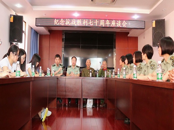 8月13日上午,南京师范大学“寻访抗战历史,共话强国梦想”小队携手73821部队5名通讯女兵及船运三中队5名男兵来到淮阴干休所,聆听张首长和蒋首长两位老干部的抗战故事。