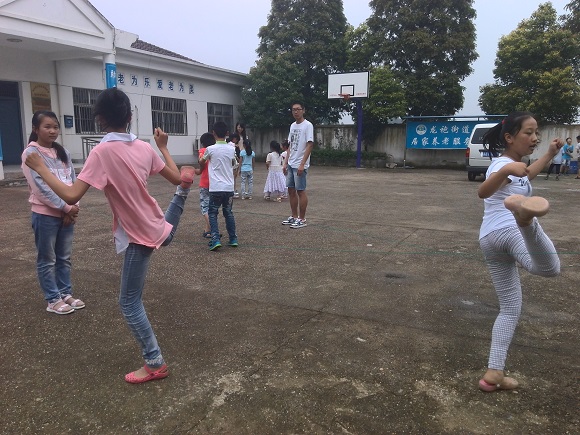 接着,在短暂的午休之后,参与暑期夏令营的同学们早早地来到了赵坝村社区活动中心,开始了有趣的民俗文化热身运动。小队成员依旧采取分组比拼的形式,根据热身运动的内容将同学们分成了两小组。其中一组同学由三位志愿者负责,进行了传统的“跳牛皮筋”游戏。在游戏中,志愿者与同学们互相切磋,交流了不同地区的牛皮筋跳法,洋溢着愉快的师生氛围。另一组的同学则由另四位志愿者带领,一起开展了传统的民俗游戏“跳房子”。生在农村的同学们对这类游戏早已熟练掌握,身姿可爱灵动,玩得不亦乐乎。为保证热身运动的安全开展,责任心极强的包铖同学以身作则,主动保护着活动中的同学们,赢得了大家的一致赞扬。