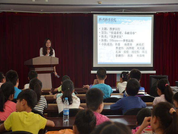 首先,在师生见面会的环节中,支教队成员依次上台进行自我介绍,与小朋友们热情互动,拉近了彼此间的距离。接着,支教队队长许盈以PPT的形式向家长和小朋友们介绍了支教队组建的宗旨以及课程安排,既让家长与学员了解了筑梦者支教队,又让他们明确了支教的课程安排。然后,支教队队员给每位小朋友都发了一张基本信息表,并且让学员们以梦想的职业为定位在表上画一幅“未来的自己”自画像,拉近自己与梦想的距离。