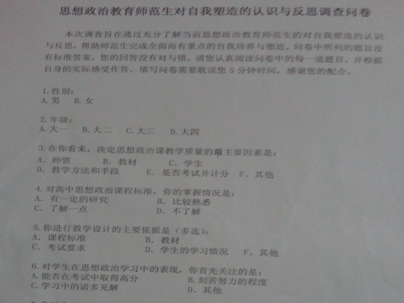为了加强本次社会调研活动的科学性与有效性,小分队成员在策划调研活动环节、研究调研活动对象方面下了一定的功夫。对于每一环节的安排都精确到了具体日期。为了合理有效地利用暑假的时间,放假以后,小分队队长就开始筹备调查问卷的设计工作。一个好的社会调研离不开一份精确的调查问卷。设计问卷的第一步就是整体的问卷构思,小分队成员紧扣师范生自我塑造和实践,围绕着课程标准、教学设计、授课方式等方面来进行问卷的设计。在分别设计了基本问题之后,小分队成员取长补短,把问题进行归类与组合,同时通过一遍又一遍细致地审核来发现问卷中的细节问题,逐渐消除问卷中出现的答案设置不全面、问题设置不严谨等问题。经过激烈的讨论后,初版问卷被发往指导老师的邮箱,经过修改形成最终的问卷。