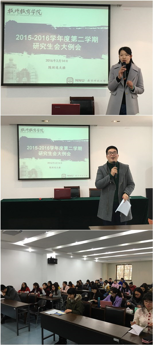 2015-2016学年第二学期2015级研究生会大例会在随园校区逸夫楼二楼多媒体教室成功召开。会议由研究生辅导员王鑫老师主持,主席团成员和各部门部长在会上做了发言。