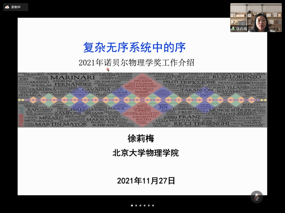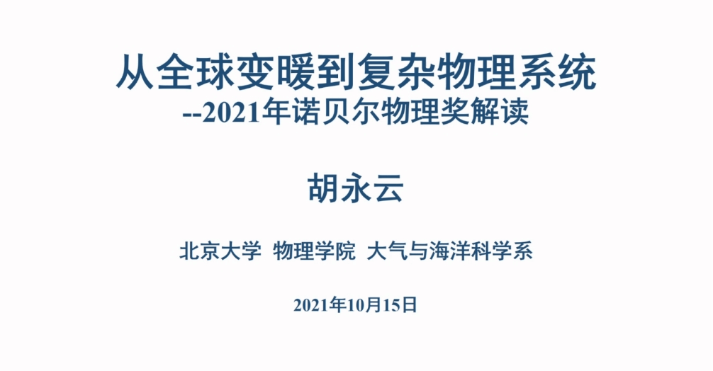 接着,北京大学博雅特聘教授,中国气象学会副理事长、国家杰青胡永云教授做了《从全球变暖到复杂物理系统——2021年诺贝尔物理奖解读》的报告。主要内容包括:什么是全球变暖?全球变暖的物理基础和科学简史,2021年诺贝尔物理学奖获奖人的具体贡献,全球变暖对我国天气、气候的重要影响,以及“碳达峰、碳中和”国家战略。同学们对物理学诺奖的成果涉及全球变暖这个全社会关注问题,物理学研究复杂系统的科学性和准确性有了全新的认识。