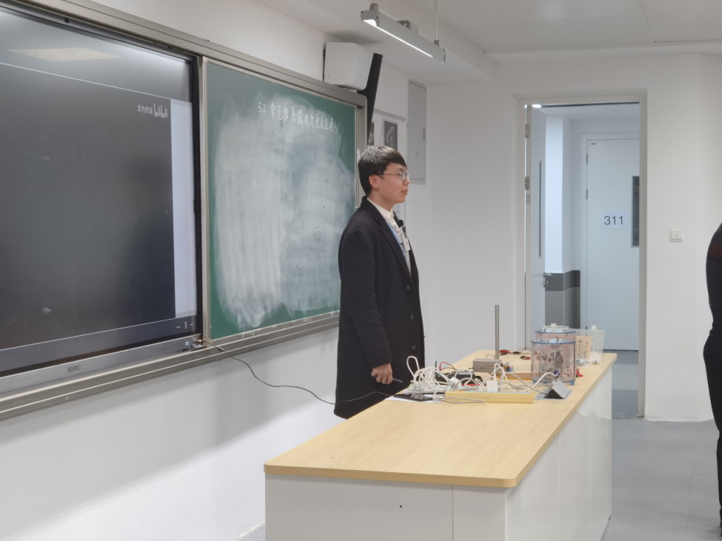 其次是由南京师范大学2022级“卓越教师”计划学科物理专业本科生杨友为同学讲授《常见传感器的原理及其运用》。杨友为用两个视频引入课程内容,并引发学生思考传感器与现代科技之间的关联。通过一个有趣的“点亮感应灯”实验,激发起学生兴趣的同时引入课程内容,并牵引到生活中其他具有相关原理的物理现象。之后,杨友为设计了学生自主实验环节,引导学生注意在科学探究过程中对比和控制变量的重要意义。除此之外,杨友为还对生活中常见的一些传感器的应用场景,如电饭煲和力传感器等,进行了实验演示和原理解释。最后,杨友为将一项基于IYPT赛题的综合探究活动布置给学生,留作本堂课课后的研讨思考题。