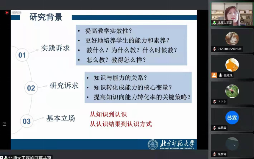 2021年12月11日下午,“随园师话”教师教育学术创新系统论坛(第二十三期)通过腾讯会议线上顺利举办。本次讲座主讲人为北京师范大学化学学院教授、化学课程与教学论博士生导师王磊教授,她以 “基于学生认识方式的学科能力、核心素养及教学改进的研究”为题进行此次讲座。讲座由博彩网址大全
