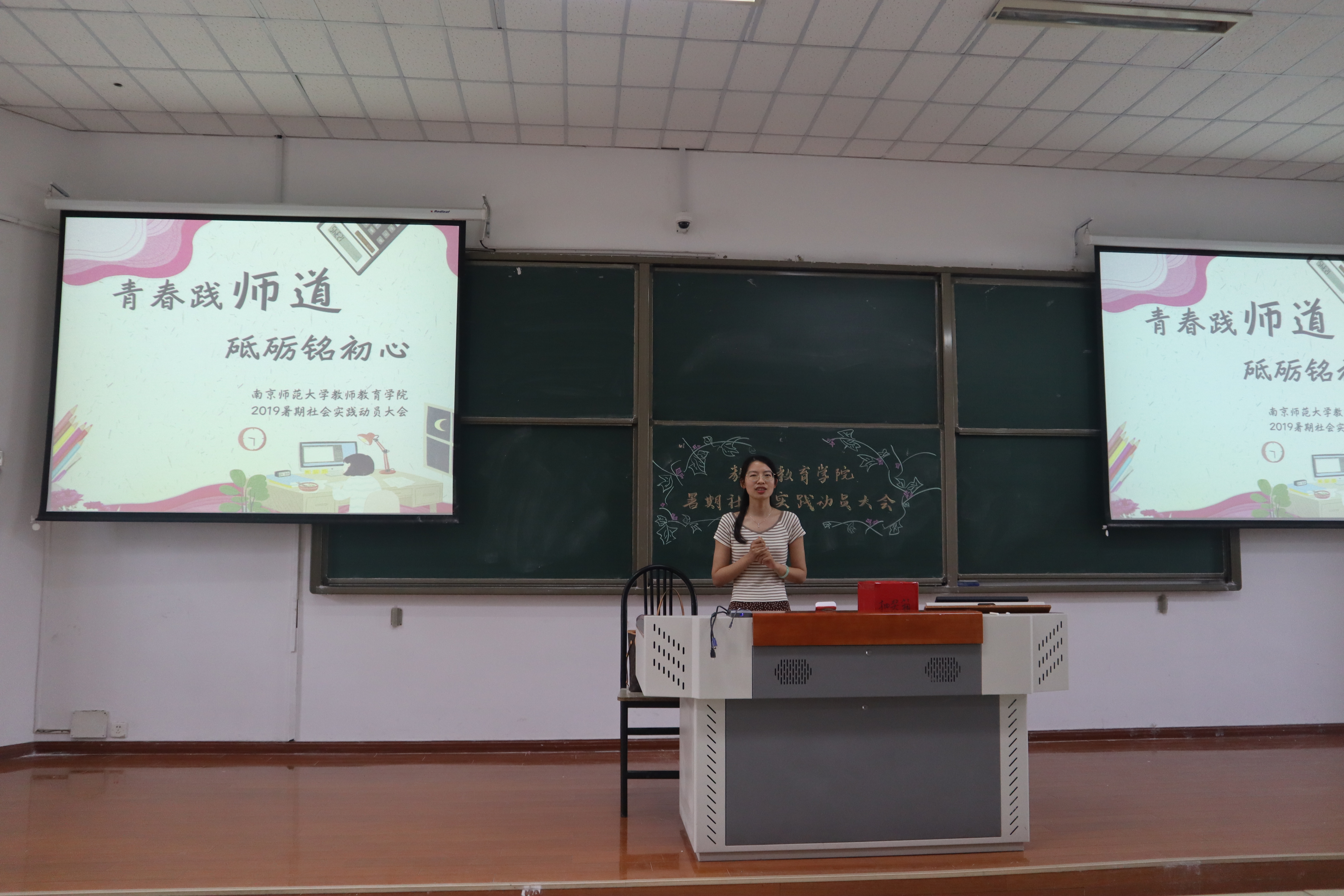 首先,王鑫老师介绍了教师教育学院暑期社会实践活动开展以来取得的累累硕果。通过一张张PPT的成果展示,在场的同学们无不为之触动。致辞过后王鑫老师表达了对18级同学们暑期社会实践开展的美好期望和真挚祝愿,博得在场同学们的阵阵掌声。