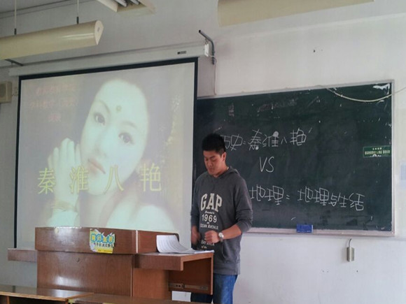 诗云:“六朝金粉地,金陵帝王州”。历史专业的庞骏在介绍南京历史时,另辟蹊径从历史的花边入手,以“秦淮八艳”为演说主题。庞骏同学在讲解的过程当中,始终秉承着胡适先生强调的“有一份证据说一分话”的史学精神,严格、准确地以史料为解说基准,在可歌可泣的风月故事里,让地理专业的同学感受到了历史学科的严谨性。另外,为增加解说的趣味性,庞骏在解说八位美人时都配以动人的美图与精妙的四字总结,在分享柳如是与钱谦益的爱情故事时更是以电影桥段为载体,辅以小故事的讲解。多变的展示形式,生动有趣的故事让地理专业的同学们沉浸在历史的亦庄亦谐中。