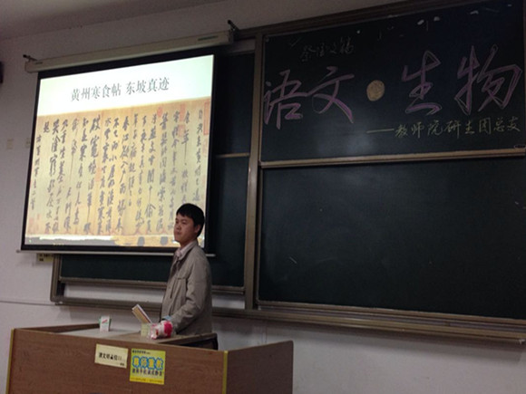 “人生识字忧患始”,语文专业的夏帅波在介绍苏轼时别出心裁地从诗帖引入,通过《寒食帖》的内容和字迹揣测苏轼书写情境,情绪变化,并在作者被抑制的情感与平稳的书体间的张力中悬揣作者的人生观。他在讲解时配以诗、书、字、画,并发表了精辟的见解。这让生物班的同学感受到了他深厚的文学素养和语文的博大精深。同时,这也给生物班的同学提供了学习语文的新思路,指引他们进入情趣兼并的语文世界。
