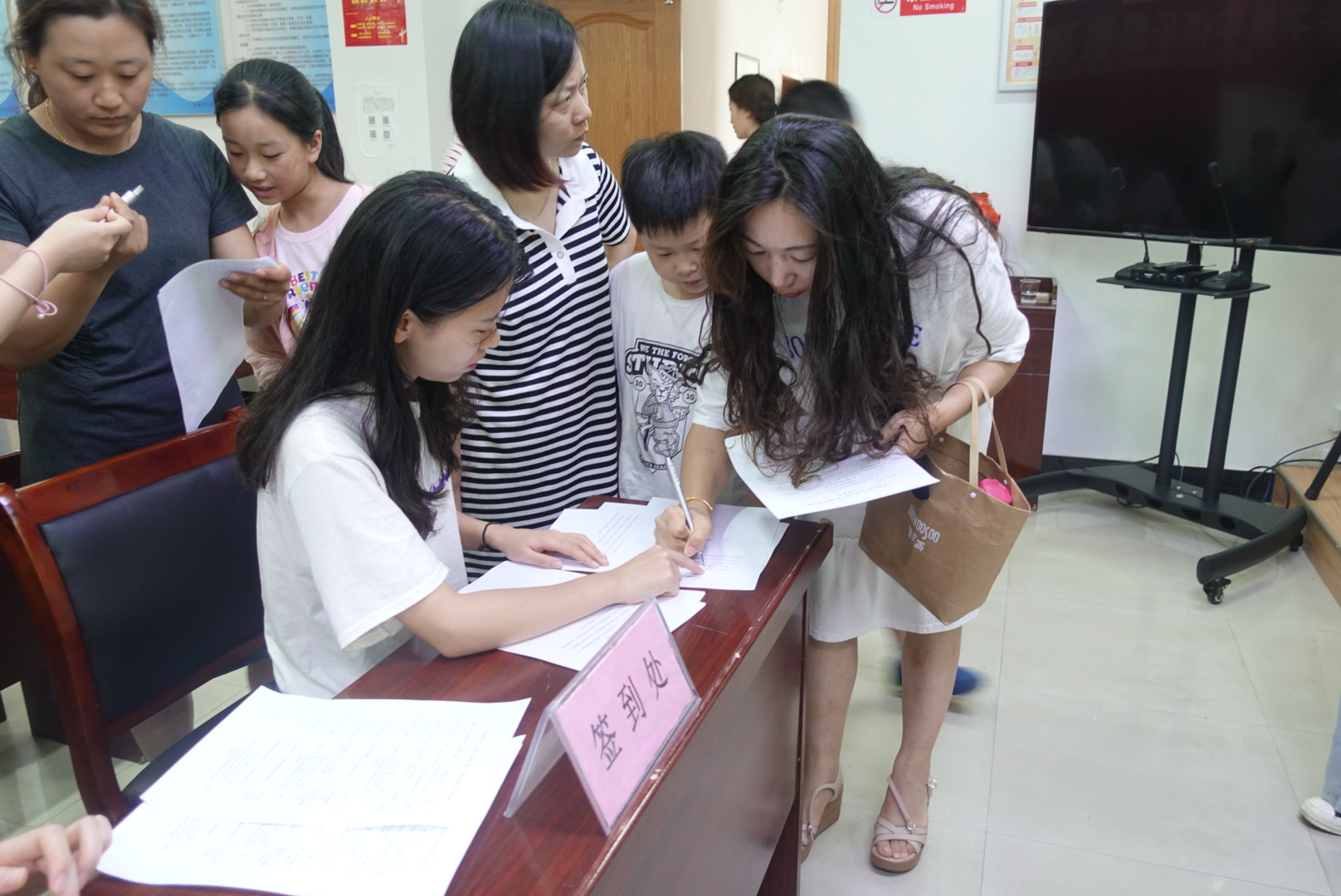 首先,家长们带着孩子们来到南京市六合区龙袍街道长江社区的二楼会议室签到,签署安全责任书并领取注意事项表和本次暑期课堂活动表。然后,由博彩网址大全