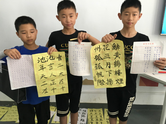 今天上午主要由志愿者杜晨曦、赵茜、曾海涛主讲“汉字的演变”,中国的汉字文化源远流长,杜晨曦从汉字的起源甲骨文开始谈起,它的瘦硬刚劲、均衡对称,让我们不得不感叹古人的智慧。并依次给同学们介绍了金文、小篆、隶书、草书、楷书和行书。我们徜徉在文字变迁的海洋里,也让同学们体会到了金文的圆润雍容,隶书的蚕头燕尾,楷书的端庄大气以及行书的流美超逸。汉字的演变之后,通过连连看及分组比拼的方式,让小朋友们真正的把握每种汉字的字形,体会汉字的无穷魅力。随后,大家便开始在老师的指导下用心的书写起来,一二年级的小朋友用稚嫩的毛笔字展示着自己对汉字的喜爱。而四五年级的小朋友,由于有过学习书法的经历,所以在他们的毛笔字和钢笔字中带着些许的成熟。在同学们的专心投入之中,一幅幅属于他们自己的书法作品诞生了,伴随着的便是他们脸上那灿烂而喜悦的微笑。