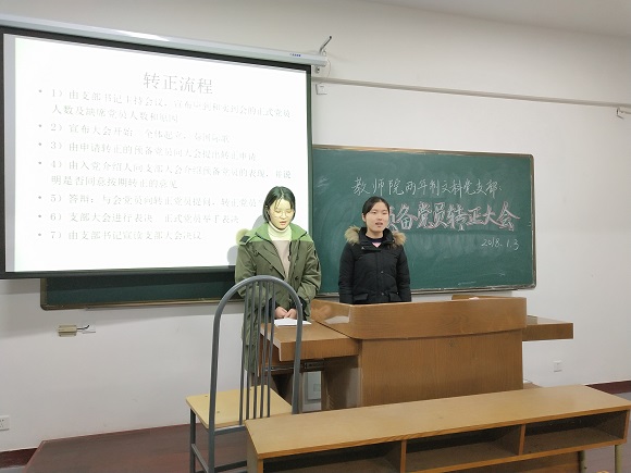 大会前,主持人万玉龙详细介绍了本次会议的主要内容,并强调在大会召开过程中如有异议,可当场提出,以此来保障大会的民主性和公平性。随后,大会在庄严肃穆的国际歌中正式开始,来自语文、英语、政治等专业的10名发展对象分别从入党动机、对党的认识、理论思想、自身的学术科研等方面依次进行了个人情况汇报,并提出转正申请。各位入党介绍人结合预备党员的教育考察情况,进一步向党支部介绍了他们在考察时期的具体表现和党群关系,实事求是地分析了各位预备党员的优点及不足,并提出详细的建议。在充分听取群众意见的基础上认为10名预备党员符合转正条件。在场的党员也对预备党员就党章、党性修养、入党动机以及如何在平时生活中起到先锋模范作用等方面进行提问,每位预备党员都结合自身的实际情况阐述了对问题的理解,并在回答问题的过程中表达了自己的决心和信念。随后,在场的党员根据所了解的情况对10名预备党员分别进行表决,皆全票通过。同时,主持人庄严宣布本次党支部预备党员转正大会决定接受唐春燕等10位中共预备党员按期转正的决议,全场报以热烈的掌声。
