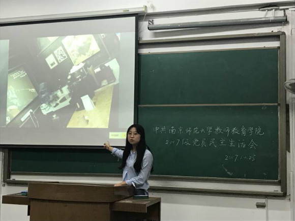 此次会议召开之前,党支部的所有党员同学已通过各种渠道关注党的十九大的消息,了解党的十九大动态,学习党的十九大精神。民主生活会上,党支部成员纷纷就所关注的党的十九大内容,表达自己的看法和见解。17文科党支部组织委员舒其镇以自己所发的一条朋友圈引入,分享了自己在收看党的十九大开幕,聆听总书记党的十九大报告时的所思所想;并结合党的十九大报告中,关于社会主要矛盾转移的论述,从历史的角度,向大家展示了党与时俱进的品质和全心全意为人民服务的宗旨,分析透彻,引发了大家的深思。民主生活会上,潘玥书记还带领大家倾听了党的十九大上的“南师声音”,了解了我校侯晶晶教授的事迹。