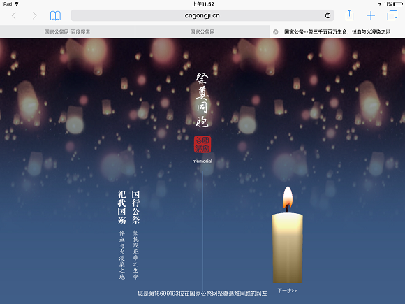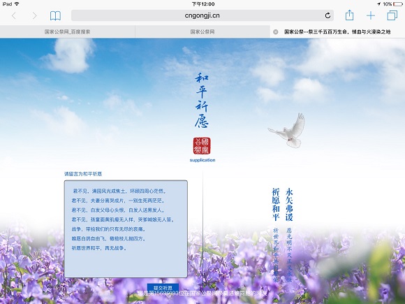 研究生登录国家公祭网进行网上祭奠,表达追思,祈求和平。在国家公祭网上,大家触击屏幕,为抗战死难同胞们点燃祭奠的蜡烛,种上默哀追思的白花,敲响警示醒世的和平大钟,最后填写留言为和平祈愿,各班团支书对大家的美好祝愿进行了收集整理。