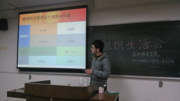 3月25日晚六点,教师院14级两年制文科研究生党支部在学政楼209教室召开了本学期第一次组织生活会。本次会议主题为聚焦两会,书记葛浩浩和组织委员赖慧珍同学主持了本次会议,支部全体党员参加了此次组织生活会。