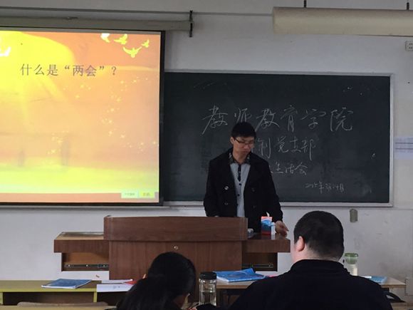在会议开始,党支部书记周德威介绍了两会的相关信息,譬如两会召开的时间、两会代表的选举方式等。紧接着,支部书记还对深化改革、依法治国、经济新常态、反腐倡廉、环境治理、财税改革、聚焦“三农”、养老改革、就业创业、大国外交等10个两会热点问题进行了详细的讲解。讲解结束后,党员同志们对感兴趣的热点问题发表了自己的意见,进行了激烈的讨论。有党员同志结合最近很火《穹顶之下》纪录片提出一系列切实可行的环保方法,建议党员同志们在实施过程中充分发挥先锋作用,从身边的小事做起,号召周围的同学们共同改善“雾锁迷城”的雾霾天气和地下水的大面积污染问题。此外,就业问题一直是研究生关注的重中之重,他们纷纷表示,有志于教育事业的学生不仅要掌握丰富的教学知识和教学技能,还应具备创新精神,将新颖的教学方法引入教学课堂中,让孩子们享受学习的乐趣;而想创业的学生不仅需要国家为其营造良好的“草根”创业环境,需要创新的理念和创业的魄力。