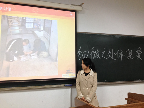 紧接着,进入生活会的第二个环节主题讨论。在这个环节中,孙欢同学带头发言,通过举出社会中的热点事件——南大小伙帮拾荒老太太处理腿伤,联系到此次主题“细微之处发现爱”,最后她强调作为党员的我们,不仅要时刻以先进的思想武装自己,而且要真正从细小之处,体现我们党员的模范带头作用。在党支书的带动下,同学们也积极的参与讨论,班长殷晓捷同学和团支书张云同学积极发言,殷晓捷同学就我们班的实际情况提出了自己的想法和建议,而张云同学更是从自己与宿舍舍友的关系出发,从与舍友们一起出游的小事中,体会舍友之间相互关爱的情谊。
