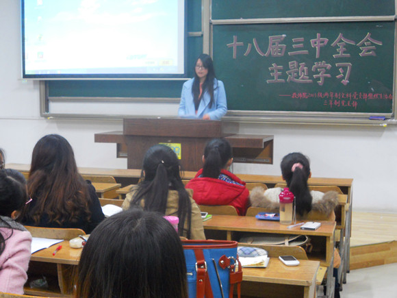 会上,两年制文科班支部书记庞骏首先对三中全会的主要内容进行了简要介绍,此外他还着重分析了党的十八届三中全会提出的《中共中央关于全面深化改革若干重大问题的决定》对全民生活带来的改变。这些改变触及各种社会现实问题,紧贴生活与就业的方方面面,从而引起了全体参会党员的热切关注与讨论。接下来,支部党员们一起观看了解读党的十八届三中全会的视频,视频对全会提出的关于我国深入改革的蓝图、主题及带来的改变进行了深入独到的分析,并以声像结合的形式向党员们展现了改革的迫切与美好前景。随后,支部党员们围绕着党的十八届三中全会的内容踊跃发言,内容涉及教育、经济、政治改革等方方面面,党员们的发言或站在教师的角度或站在学生的角度或站在社会公民的角度,全面生动地阐释了自身对招考制度、开放二胎、延迟退休等改革热点的看法,这些看法独到深刻,不时赢来参会同学的阵阵掌声。此外,发言同学还表示,作为学生党员,在深入改革的浪潮面前我们更应该做好思想、学习、实践等方面的准备,紧随中央步伐,加强党性修养,从身边的小事做起共同推动改革的顺利进行,为实现中国梦而共同奋斗!最后,三年制支部书记孙欢对此次组织生活会进行了总结,她指出作为学生党员,我们应肩负起责任和使命,要积极关注党的十八届三中全会并加强全会精神的学习和宣传,为日后成为改革的中坚力量而努力。