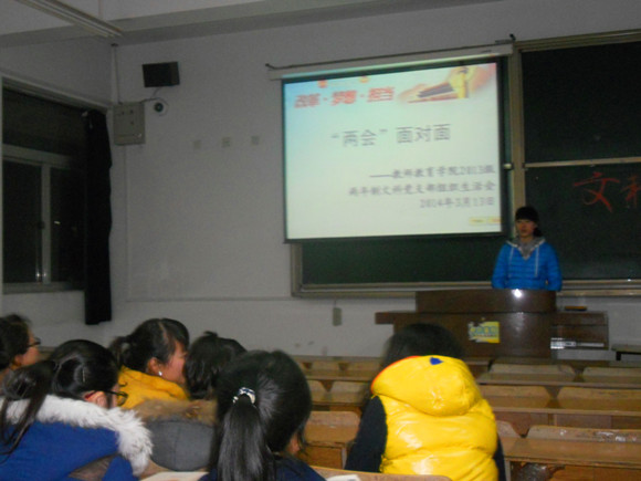 春暖花开之时,乘着两会的和煦春风,3月13日晚7点,在南师大仙林校区北区209教室教师院13级硕士文科班党支部顺利召开了本学期第一次组织生活会。本次会议主要包括“学习两会精神”和“生命安全教育”两大部分内容,文科班党支部副书记王荣慧主持会议,文科班党支部绝大多数成员参与了会议并积极进行了讨论发言。