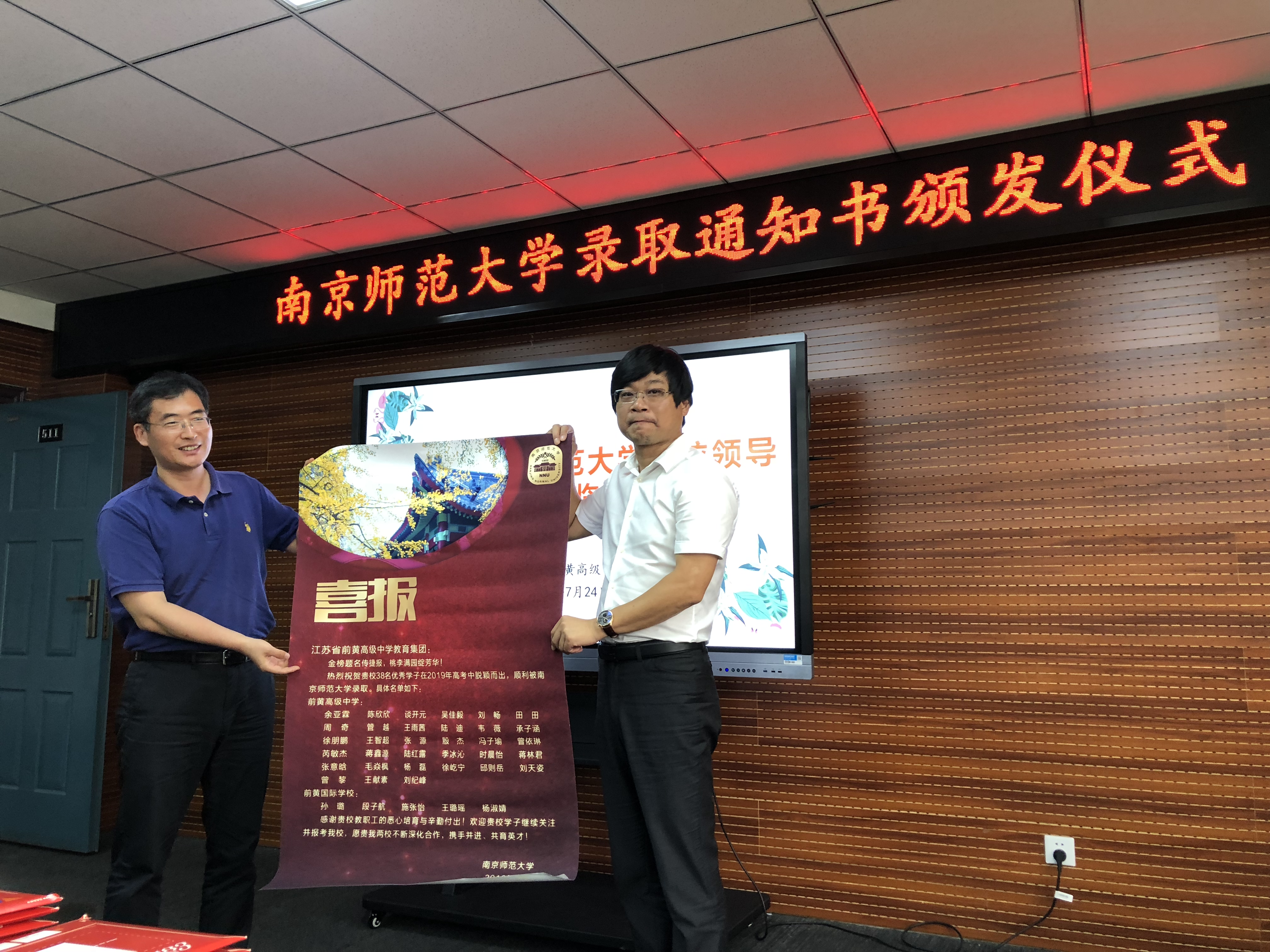 7月24日上午,南京师范大学党委副书记尚洪波一行专程前往江苏省前黄高级中学,为考取南京师范大学的38位同学现场颁发录取通知书。南京师范大学学工处和博彩网址大全
