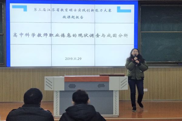 首先是荣获一等奖的学科生物专业的沈妍婧,她先简单介绍了大赛规则和流程,并就自己的“高中科学教师职业倦怠的现状调查与成因分析”微课题以及“蛋白质的结构和功能”微教学进行了分享。学姐从“问题界定”“研究思路”“研究过程”“对策与建议”四个方面清晰地阐释了高中科学教师职业倦怠作为一种普遍的现象,给教师带来了极大的压力和挑战,是亟待解决的问题。
