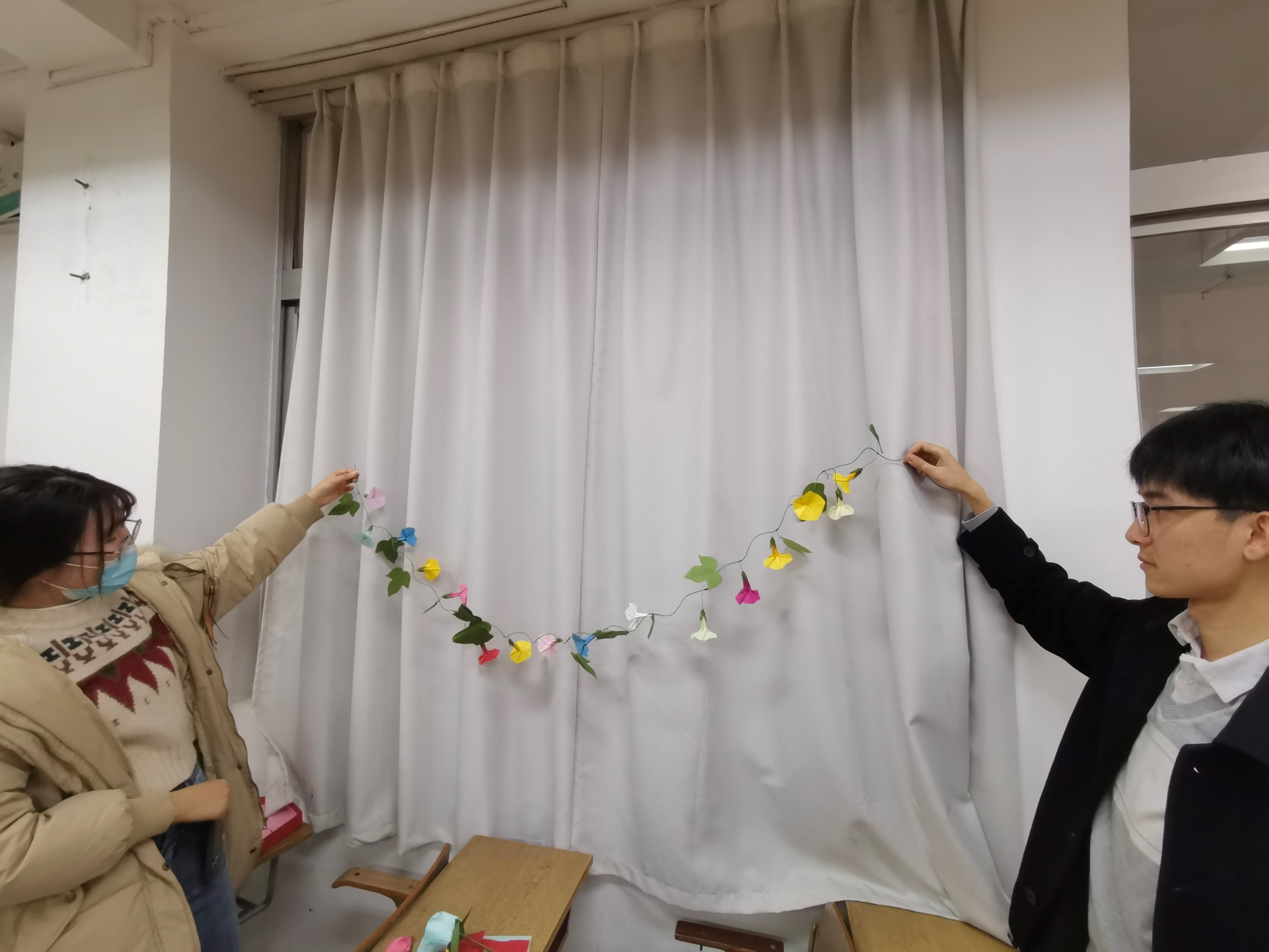 陈娴教授应邀参加。首先,许老师向同学们讲授了玫瑰叶子与花托的折纸制作方法,其精湛的技艺令同学们叹为观止。在许老师的引导下,同学们也开始尝试实践制作,组装技巧在练习中逐渐娴熟。在同学们实践的同时,许老师为同学们展示了其他逼真的原创折纸作品,介绍了不同玫瑰的形态和区分技巧,并宣布将这些作品作为奖品,奖励给折纸技艺最为精湛且乐于帮助其他同学完成折纸的同学。此外,许老师还对折纸作品的形态和受力进行了分析,启发同学们教学资源来自生活,要学会留意生活中的点点滴滴。课程最后,许老师将同学们的牵牛花做成了花串,同学们望着共同完成的杰作,内心的喜悦溢于言表。本次折纸活动提升了“卓越教师班”同学的动手能力和综合素养。