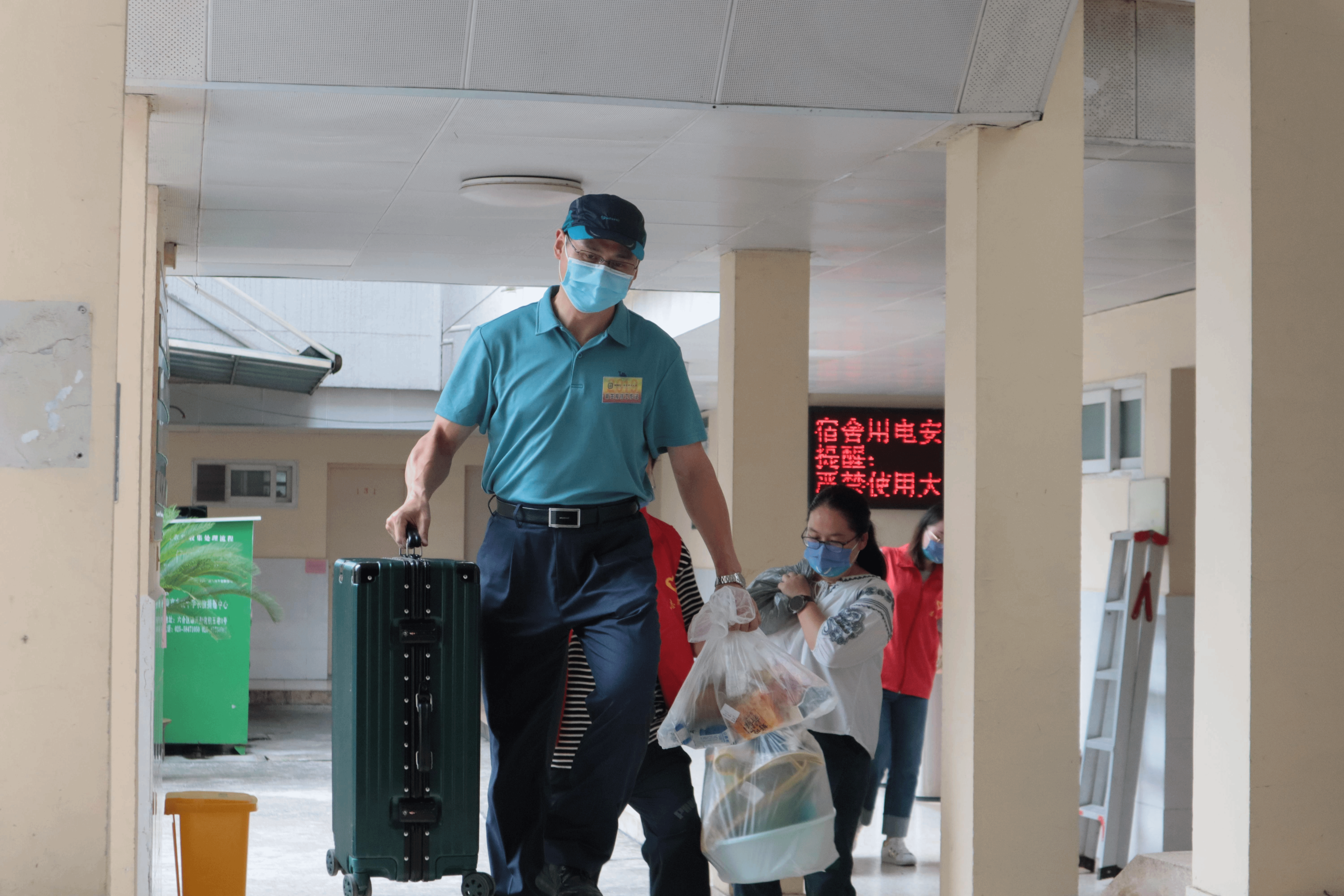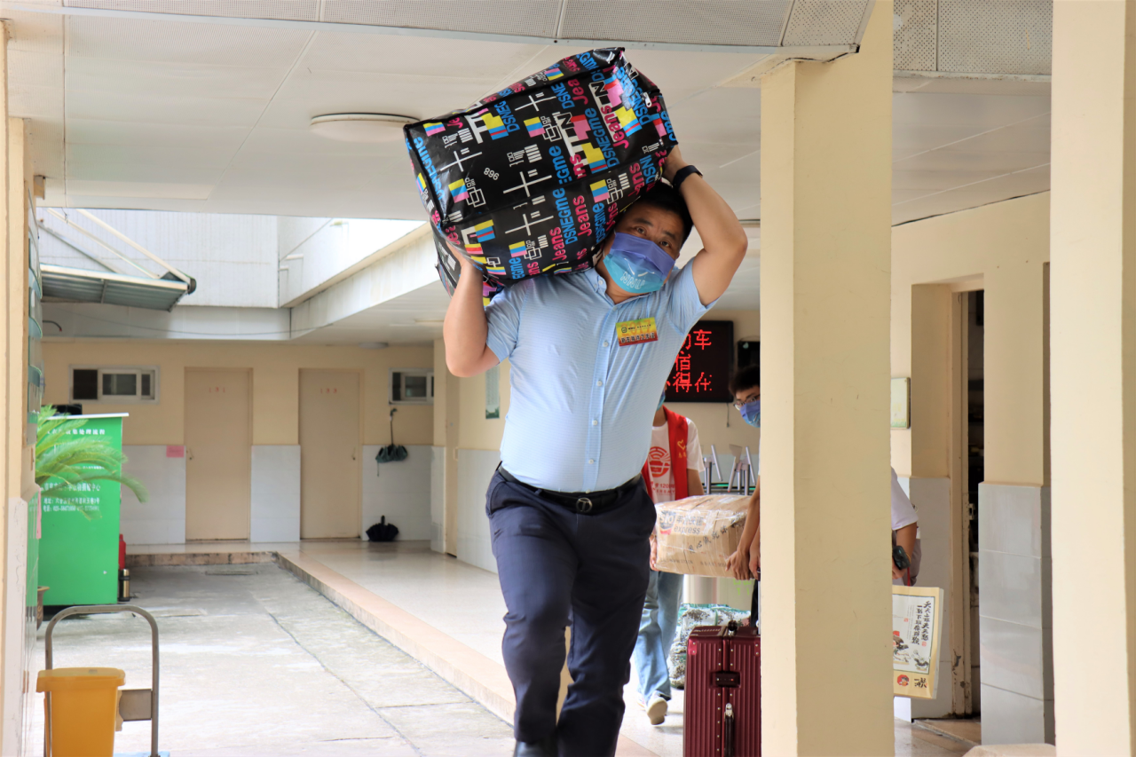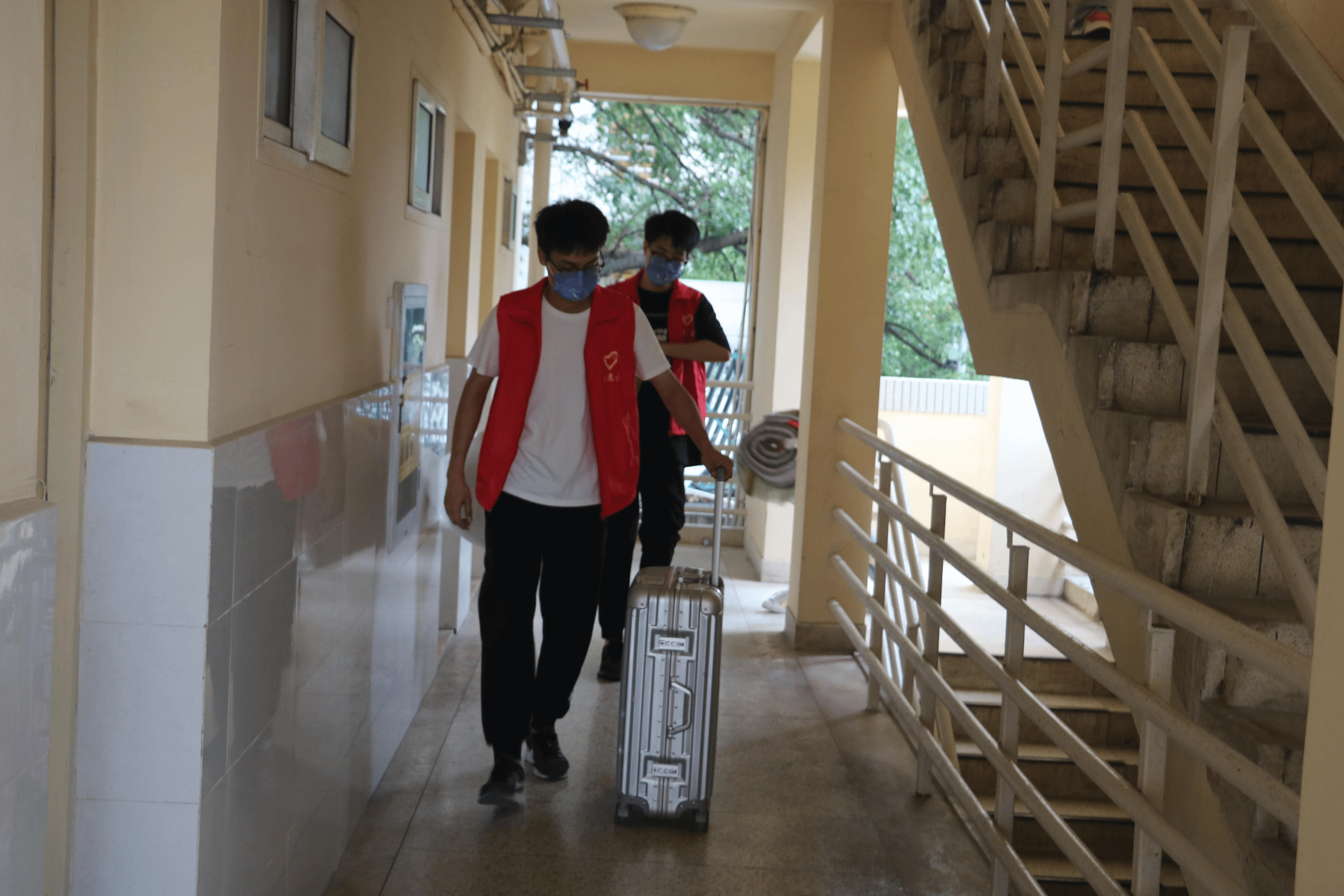 早上七点,师生志愿者们便早早地来到了化成楼大厅以及南区21、22栋宿舍楼下,有条不紊地进行立绘展板、物资搬运等各种场地的布置工作。八点左右,前来报到的学生陆续增多。宿舍楼里,师生志愿者们在楼层间来回穿行,帮助新生将一件件行李送入宿舍,师院用实际行动将人文温暖延续下去。