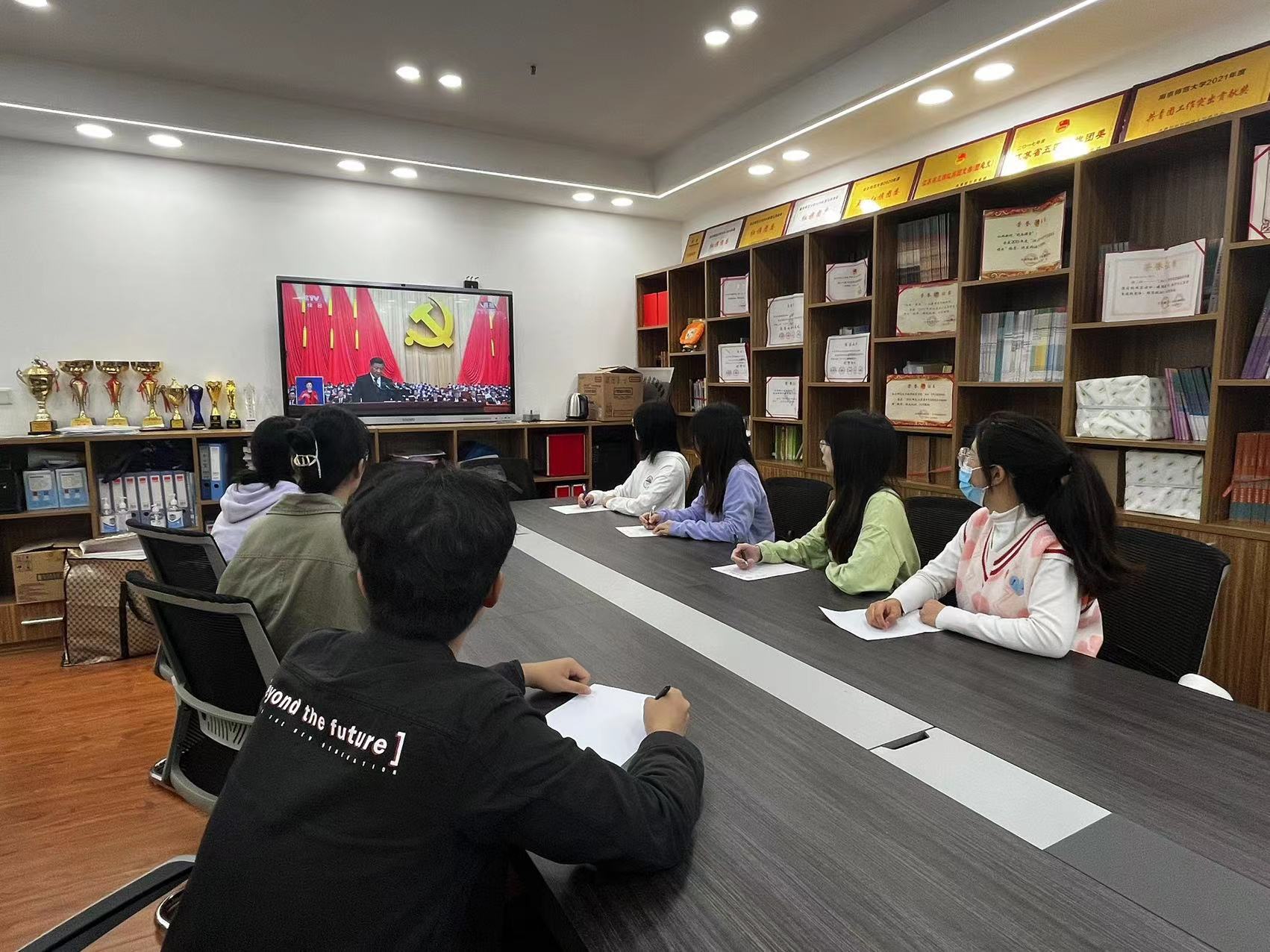 观看过程中,师生们心潮澎湃,无比激动。大家一致认为习近平总书记的报告高屋建瓴、气势恢宏、内容丰富、论述精辟,全面总结了过去五年的工作和新时代十年的伟大变革,深入分析国际国内形势,全面把握新时代新征程党和国家事业发展新要求、人民群众新期待,制定行动纲领和大政方针,从战略全局上对党和国家事业作出规划和部署。师生们纷纷表示将满怀信心奋进新征程、建功新时代,扎实履职尽责,主动担当作为,积极开拓进取,以实际行动推进中华民族伟大复兴。