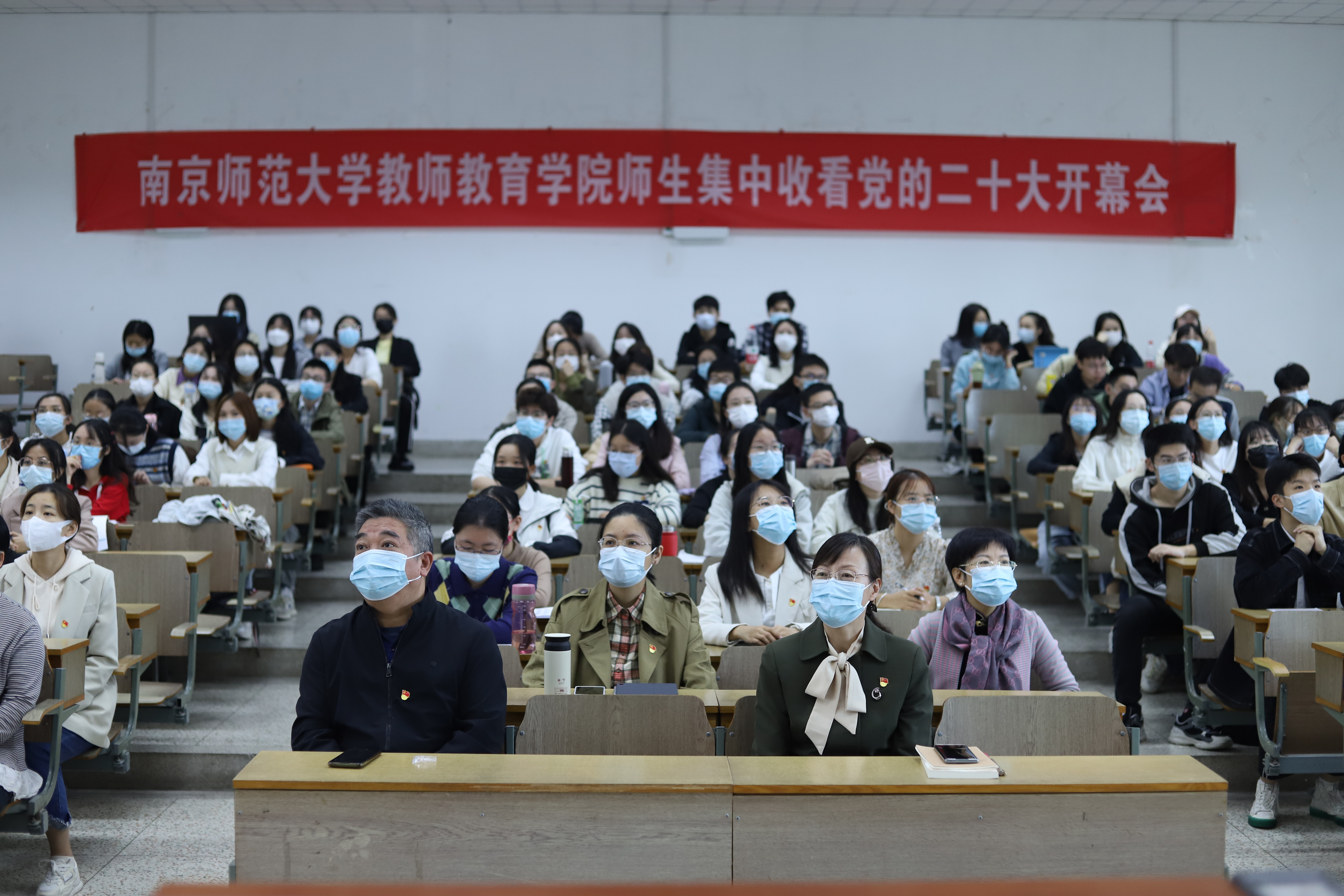 在校师生集中在学明楼401教室观看