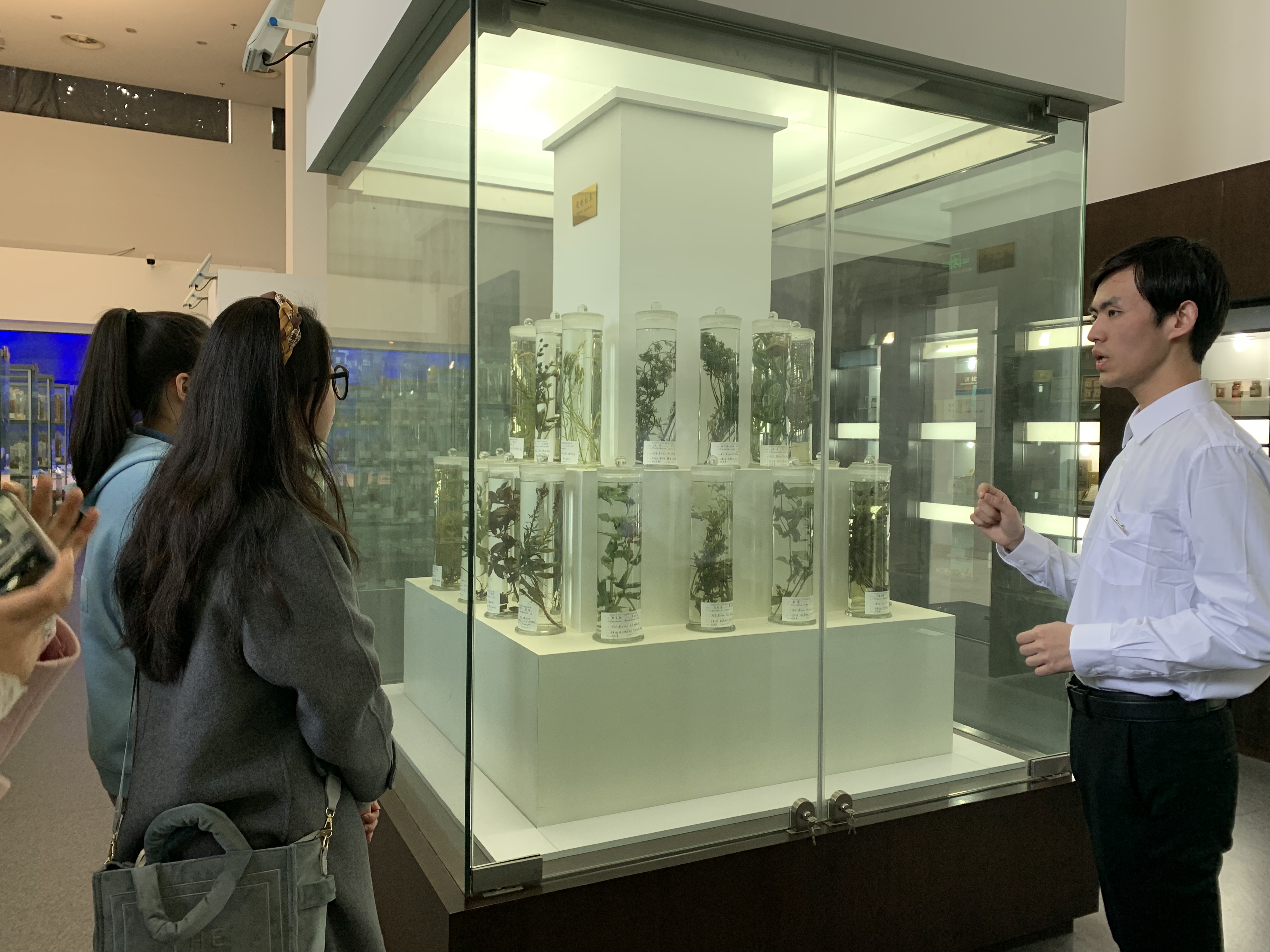 接着,同学们上到了三楼展厅,参观了装在浸制瓶中的植物标本、海洋药物标本以及全国各地老字号制药厂生产的中成药,讲解员细致地介绍了不同药物的功效,同学们也借此机会了解到了许多养生小知识。