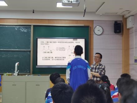 高二年级第一节课是王延广老师的《高分子材料——可降解高分子》,本节课是高二学生在一轮复习前的最后一节新课。王老师从塑料的发明给人们生活带来便利,但同时也带来了环境问题切入主题——化学提供的解决方案:可降解高分子的合成。其中王老师在讲述聚-3-羟基丁酸酯以及聚乳酸的热稳定性等问题时,基于学生对有机物结构与性质关系以及反应原理知识的认知,引入可降解高分子的化学前沿成果,让同学理解化学科研工作中所包含的基本概念和学科思维,也让同学看到科学研究就是一个在前进中不断解决问题过程。